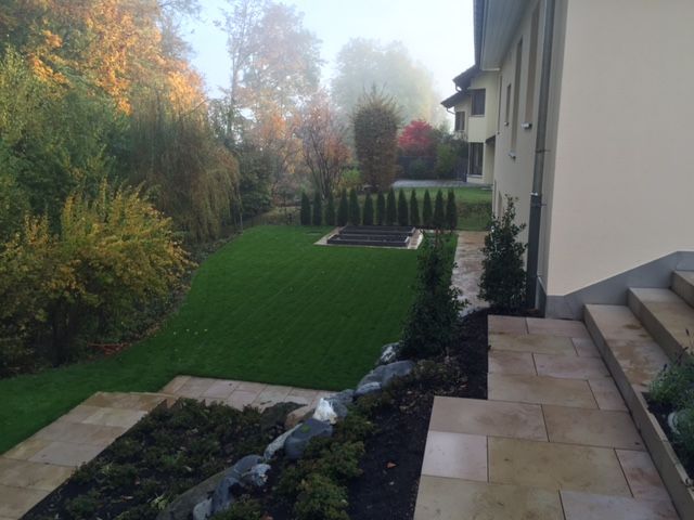 Wir erstellen eine Rohplanung, setzen den notwendigen Untergrund gemäss Rohplanie und setzen danach fort mit den Plattenbelägen, Steinborden und Mauern sowie der Planung der Grünfläche.